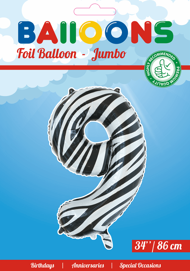 Folie Ballon Cijfer 9 Zebra XL 86cm leeg