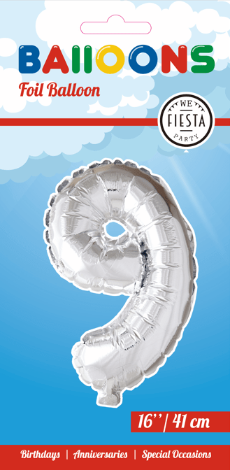 Folie Ballon Cijfer 9 Zilver 41cm met Rietje