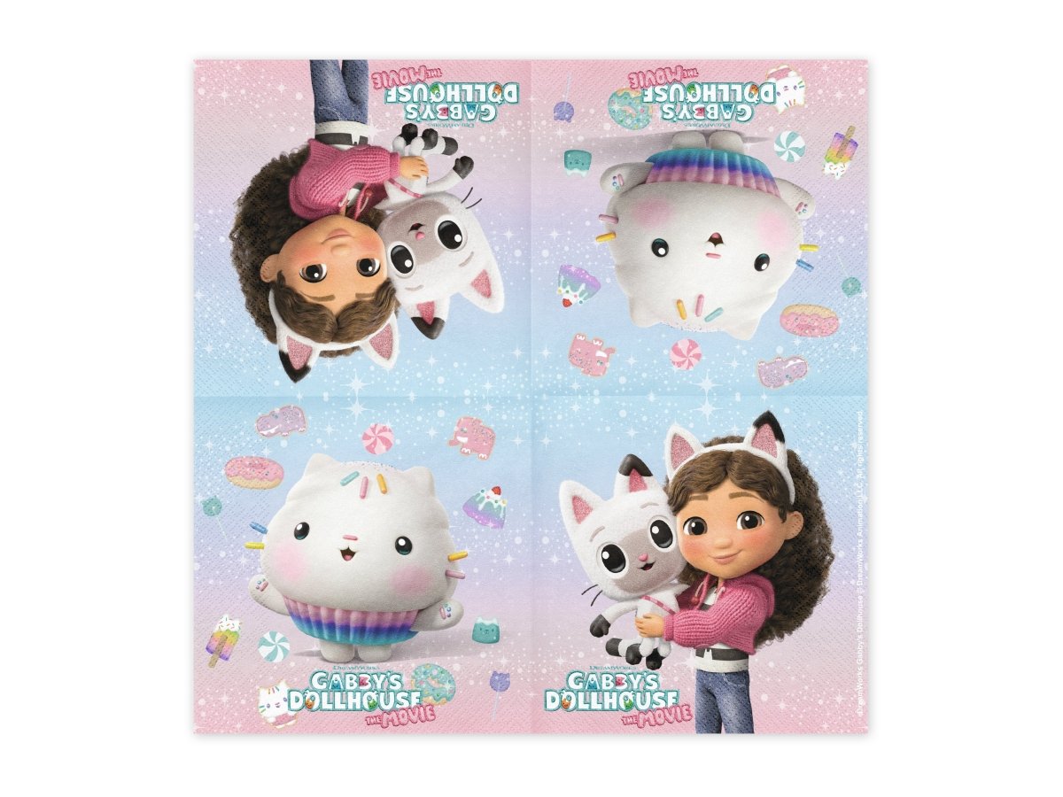 De servetten hebben een formaat van ca. 33 x 33 cm wanneer ze zijn uitgevouwen en ca. 16,5 x 16,5 cm wanneer ze gevouwen zijn. Perfect voor kinderfeestjes en themafeesten rondom Gabby’s Dollhouse.