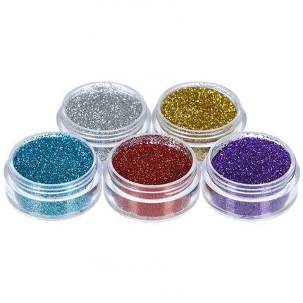 De Basic Glittertattoo Glitter Set van Superstar bevat 5 schitterende kleuren glitters, elk in een potje van 5 ml.