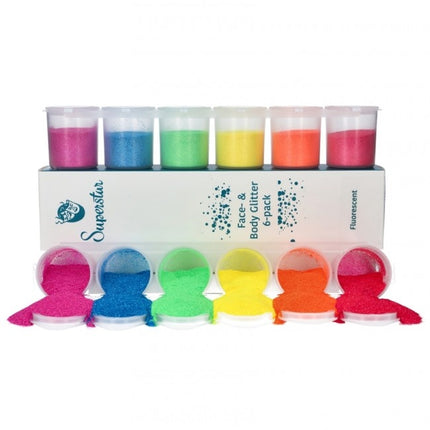 Deze glitter sixpack van Superstar bevat in totaal 90 ml glitters. Voor het beste resultaat kun je de glitters aanbrengen op een dun laagje stoppelpasta. De stoppelpasta van Grimas kan gemakkelijk over schmink of make-up worden gebruikt. Voor gebruik in het haar kun je eenvoudig haargel toepassen.