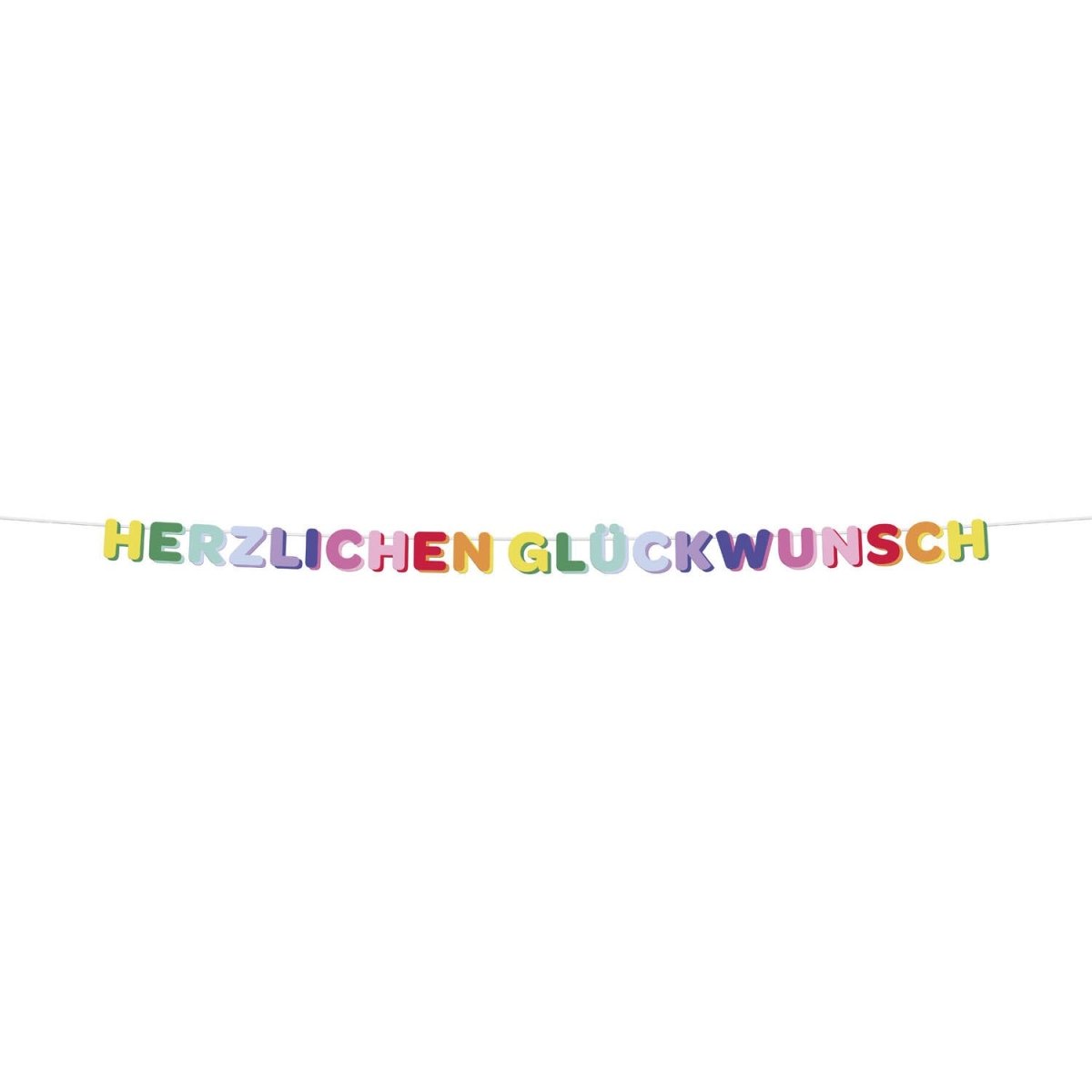 Veel geluk! Letterslinger - "HERZLICH GlÜCKWUNSCH" - Stripetastic - 2,6 m. Inhoud: 1 letterslinger. Bijvoorbeeld te gebruiken tijdens de volgende feestgelegenheid/feestgelegenheden: Jubileum, Verjaardag, Bruiloft. Een kleurrijke slinger met de Duitse tekst "HERZLICHEN GLÜCKWUNSCH" (letters ongeveer 14 cm hoog, 21 letters in totaal) Enkelzijdig bedrukt. Alle letters kunnen heen en weer worden geschoven over het witte lint. De slinger is 3,5 meter lang. Deze letterslinger set hoort bij de Stripetastic collectie van Folat. Dit artikel is gemaakt van papier.