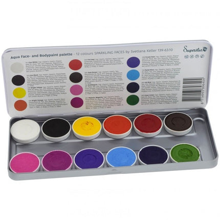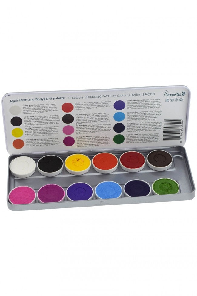 De Superstar Schminkpalet Sparkling Faces van Svetlana Keller bevat 12 kleuren hoogwaardige waterschmink die voldoet aan de strenge Europese Cosmetica Wetgeving (1223/2009/EG).