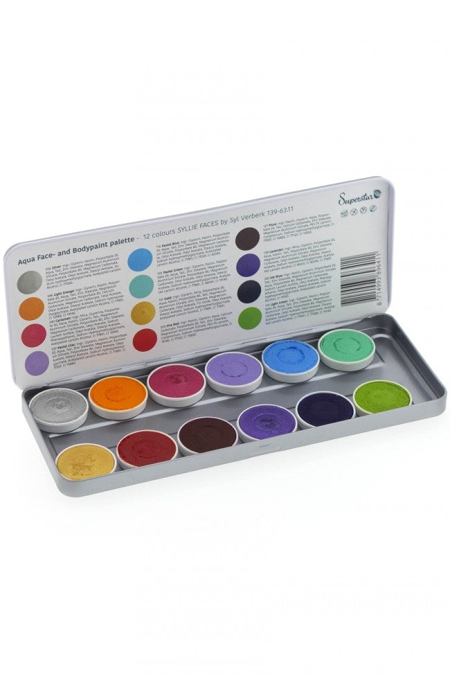 Het Superstar Schminkpalet Syllie Faces, gecreëerd door Syl Verberk, bevat 12 prachtige kleuren waterschmink van hoge kwaliteit. Deze schmink voldoet aan de strenge eisen van de Europese Cosmetica Wetgeving (1223/2009/EG).