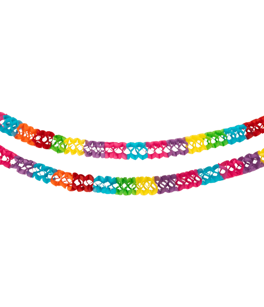 Papieren slingers zijn een absolute musthave in een feestwinkel en Paper garland - 2pcs chair garland is hierop geen uitzondering! Met deze vrolijke kleuren zijn deze slingers perfect om de stoel van de jarige mee te versieren. Met een lengte van 2,5 meter en 2 slingers per verpakking weet je zeker dat er voldoende versiering is. Naast deze paper garlands vind je bij ons nog meer verschillende soorten slingers. Zorg er dan ook voor dat je deze bij elkaar presenteert in de winkel, zodat de klant direct kan zien wat er zoal te verkrijgen is.