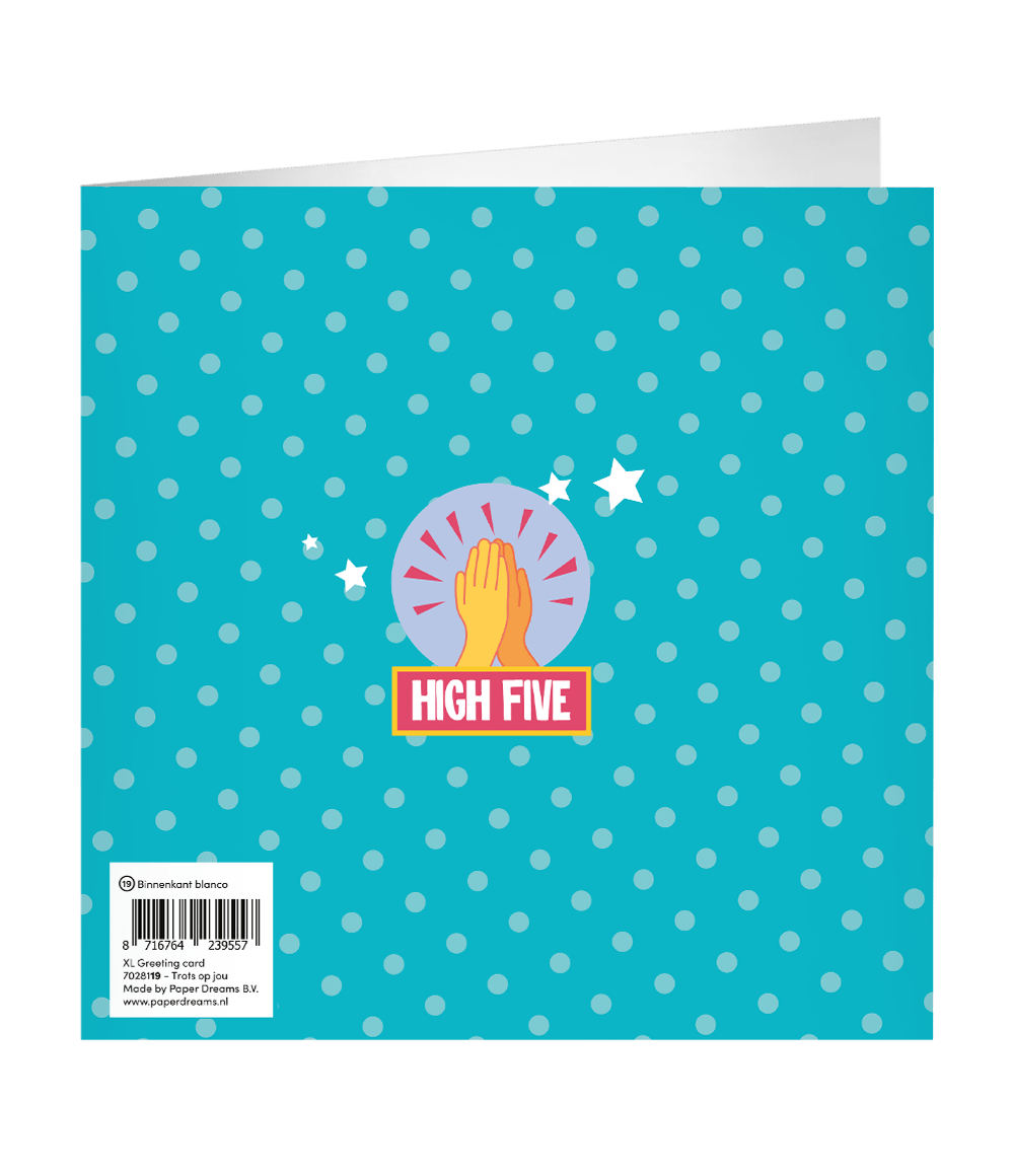 XL Greeting cards - Trots op jou is de perfecte kaart om te versturen om iemand een hart onder de riem te steken. Niet alleen het leuke design zal opvallen bij de ontvanger, ook de grote afmeting van ongeveer 23 x 23 centimeter is gewoon niet te missen!