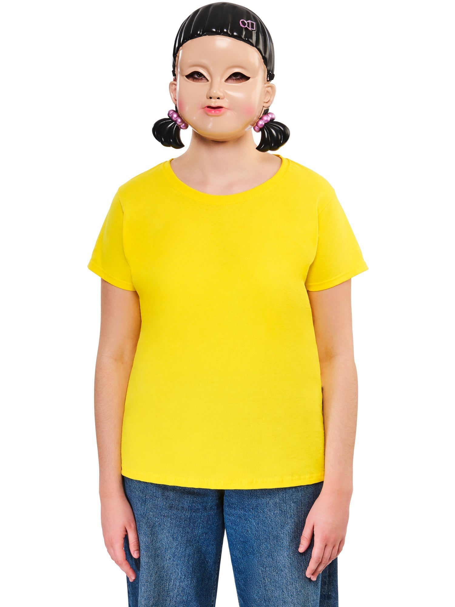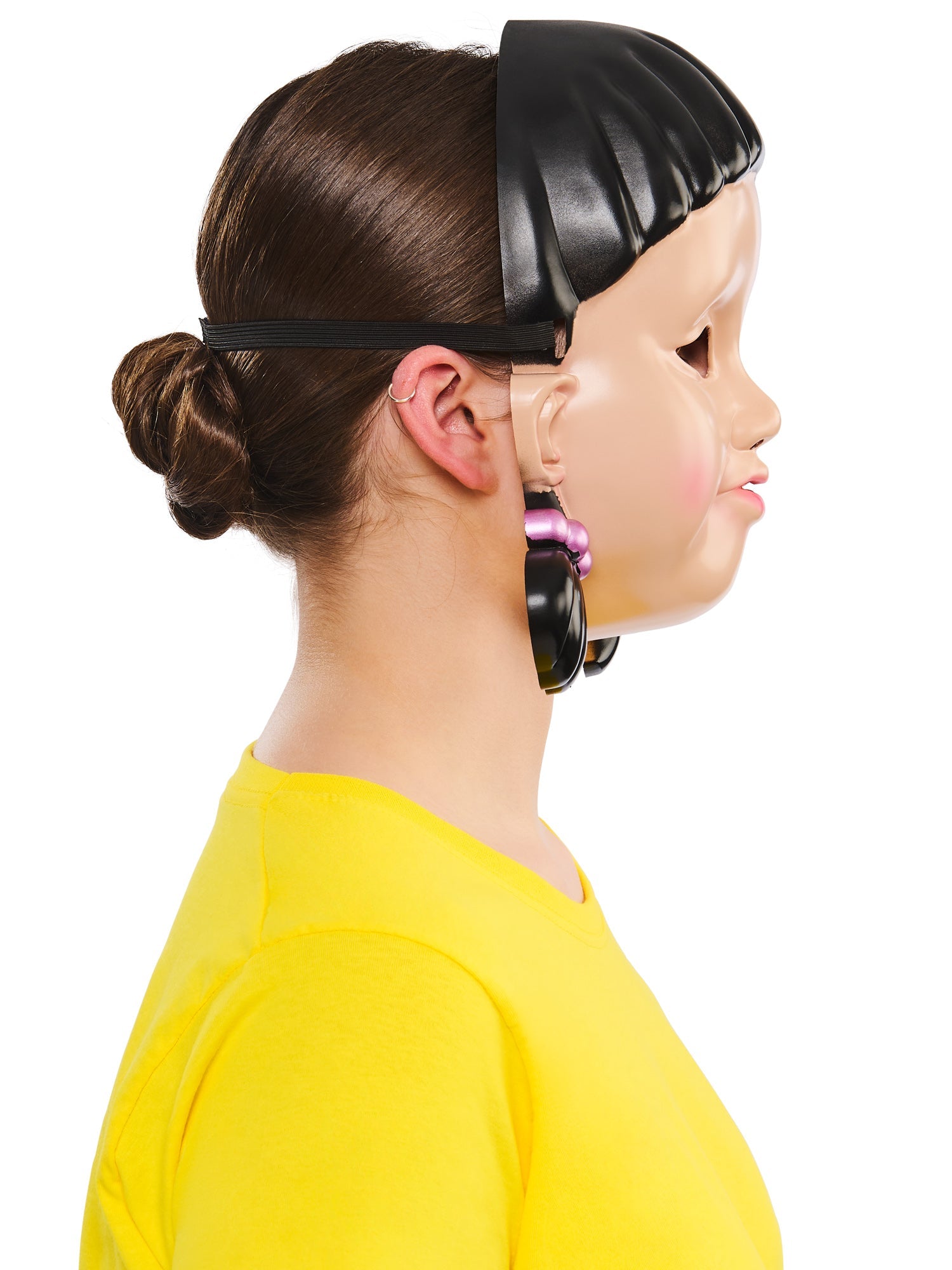 Verander in het griezelige en mysterieuze personage van de iconische Girl Doll uit Squid Game met dit zorgvuldig gevormde halve masker. Perfect te combineren met een kostuum voor een complete Halloween-look.