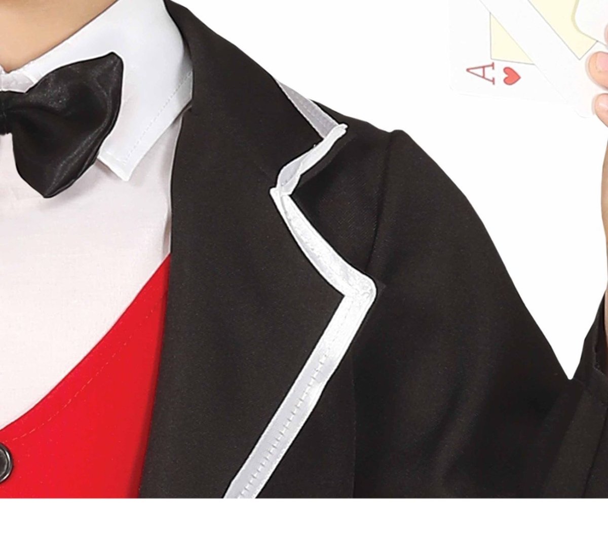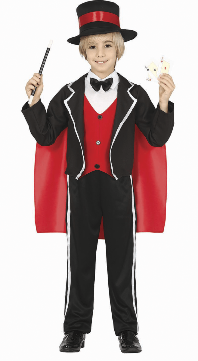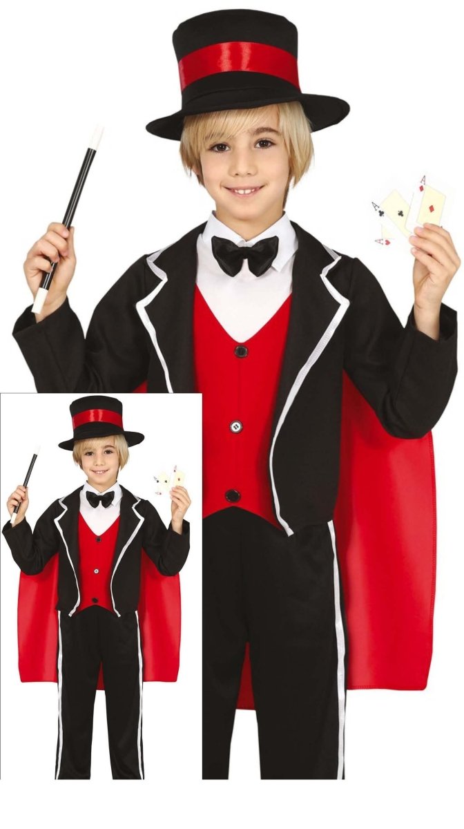 Inhoud: Goochelaar hoed, arpon met vlinderdas, jasje met gilet, broek