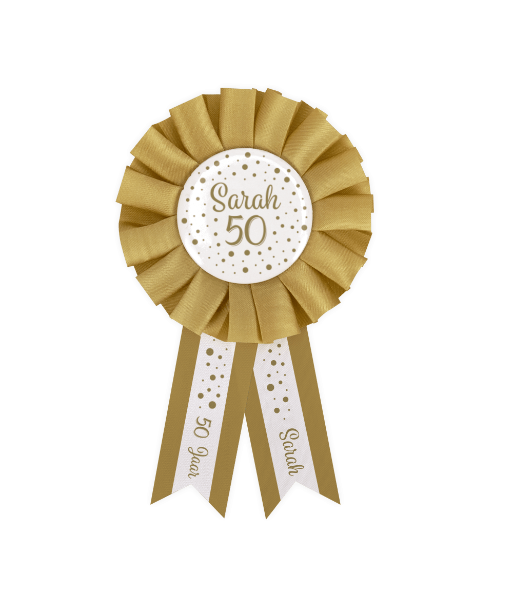 Een leuke collectie feestelijke rozetten met alle kroonleeftijden in de kleuren gold/white. Party rosettes Sarah 50 zijn erg leuk om op te spelden als er iemand Sarah ziet.