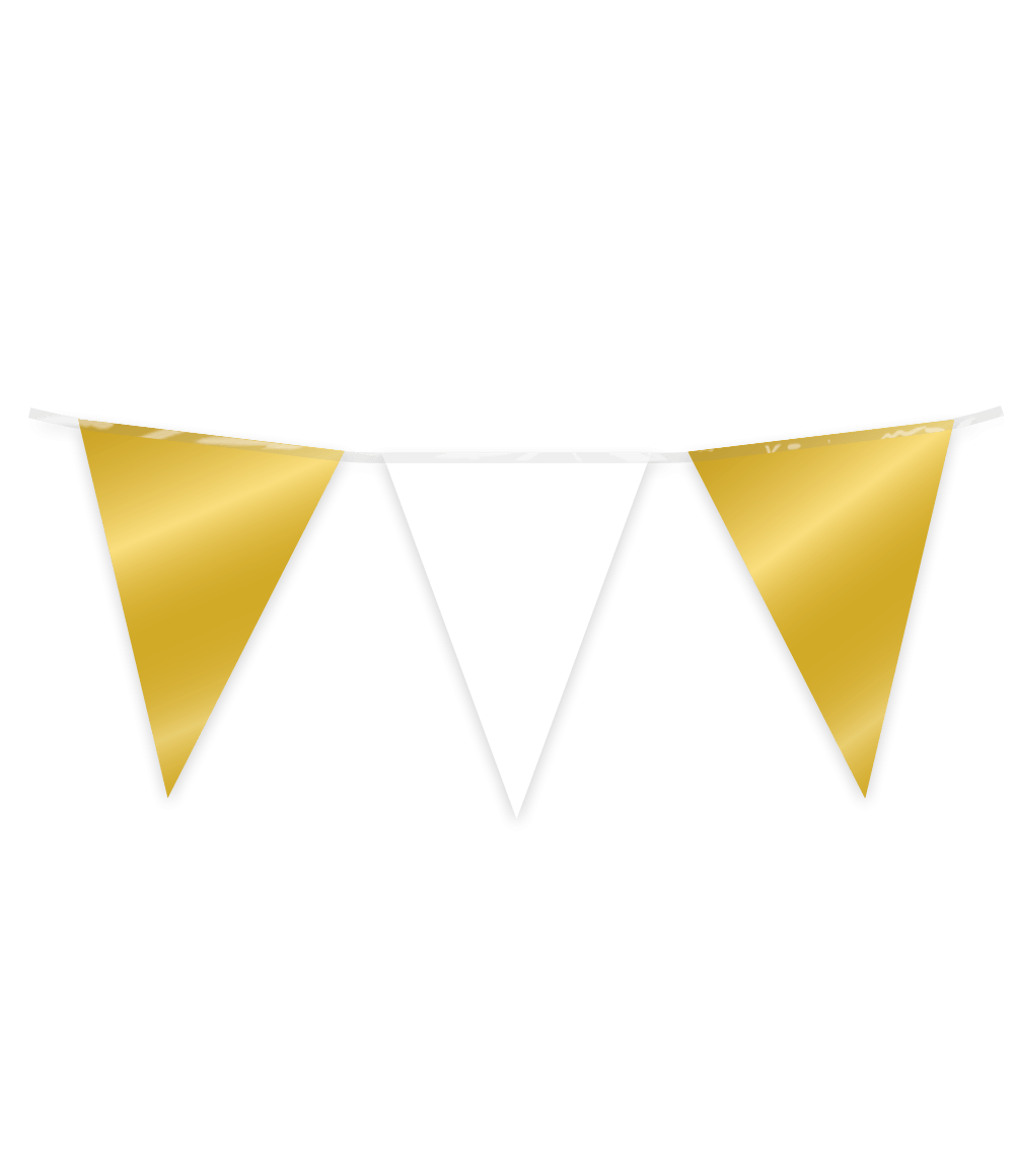 Een feestje kan niet zonder vlaggetjes en als je deze party flags foil gold and white koopt dan haal je direct een vlaggenlijn met een unieke kleurencombinatie in huis! De vlaggetjes zijn gemaakt van folie en de vlaggenlijn is 10 meter lang.