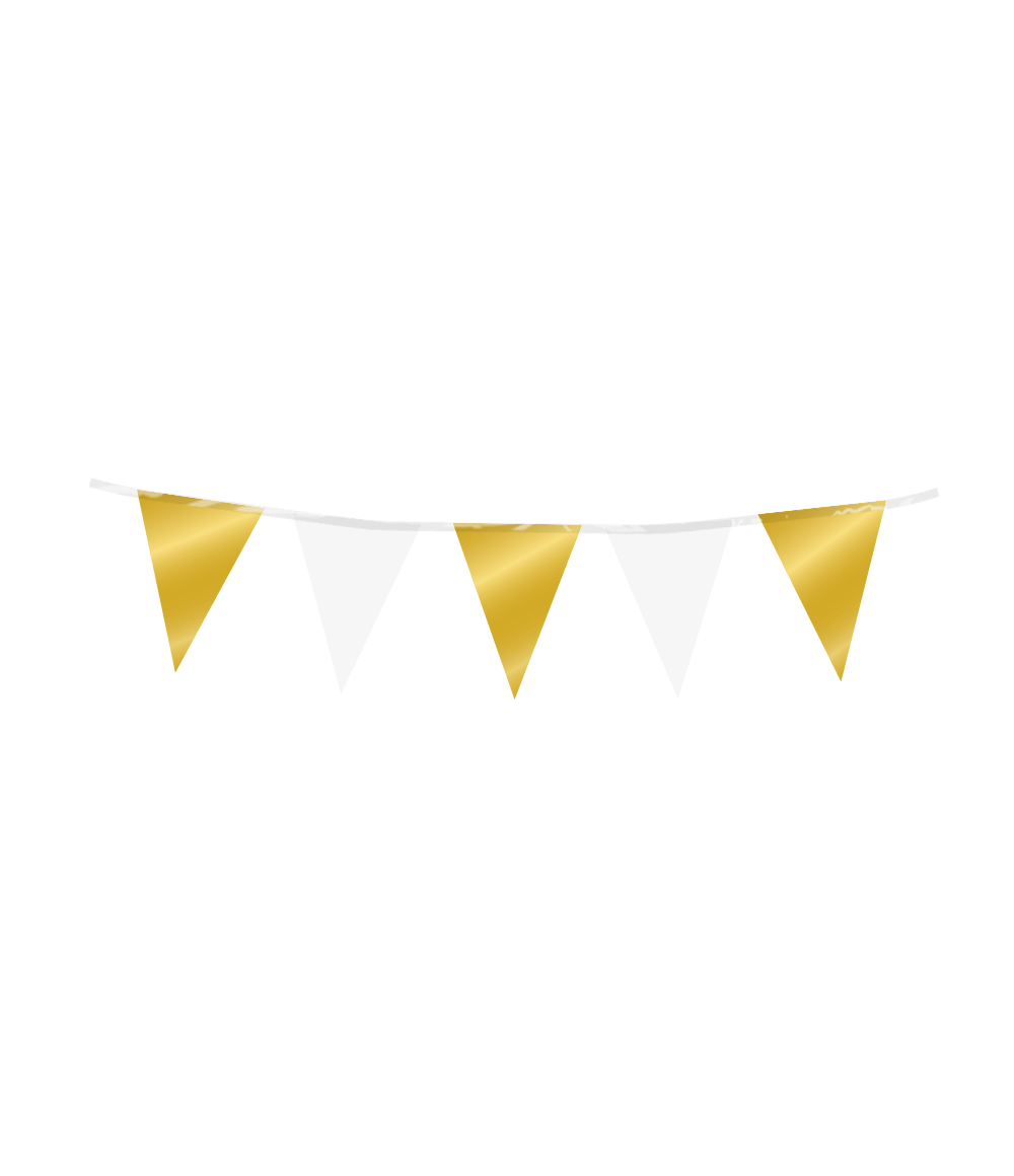 De mini party flags van Paper Dreams zijn geschikt voor elk type feestje en deze in de kleuren goud en wit is daar zeker geen uitzondering van. Deze mini vlaggenlijn is gemaakt van het materiaal folie en is 3 meter lang. De vlaggetjes zelf zijn 15cm.