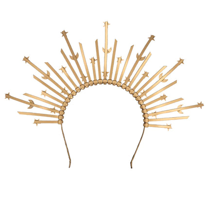 Met een halo crown kan je een festival, feest of bruiloft outfit laten stralen. Deze mooie gouden halo kroon diadeem is versierd met halve maantjes en sterren en geeft elke outfit een magische Boho uitstraling. Daarnaast kan deze unieke accessoire ook een origineel Carnaval of Cosplay kostuum als godin een finishing touch geven.