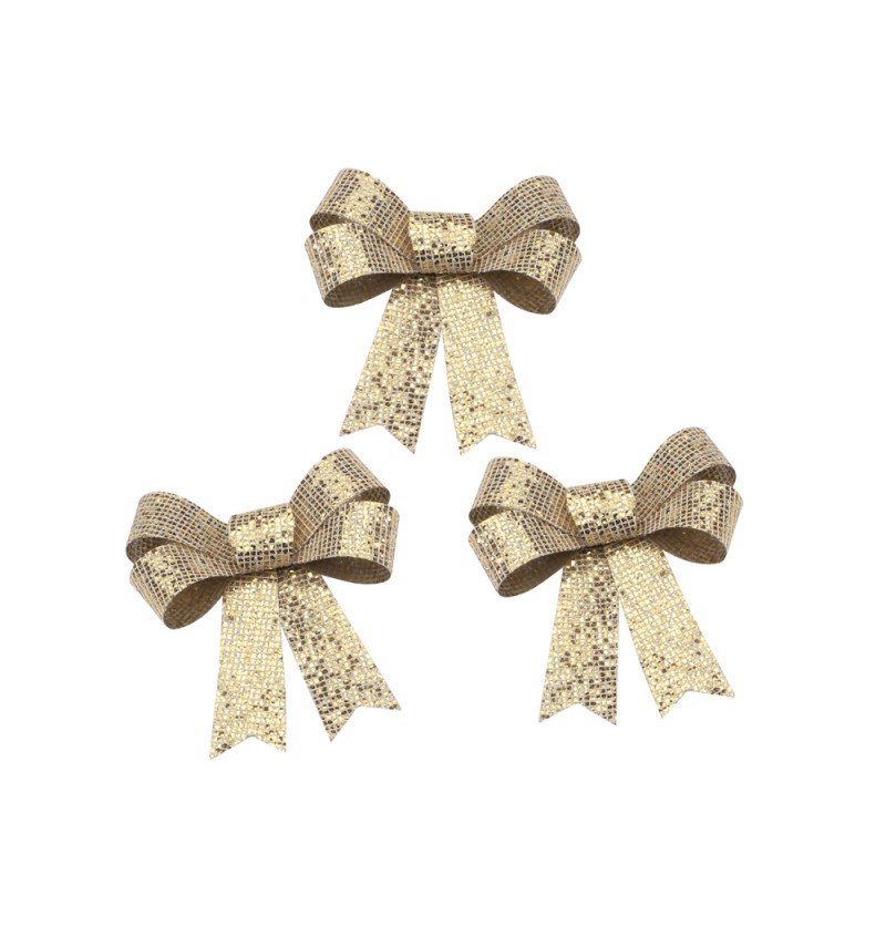 Maak je cadeaus en decoraties extra sprankelend met deze set van 3 HQ PVC gouden strikjes met glitters. De glitters zorgen voor een feestelijke uitstraling en maken iedere versiering direct opvallend.