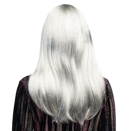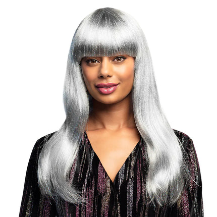 Deze pruik is een absolute blikvanger met zijn grijze lokken die subtiel versierd zijn met sprankelende parelmoer glitters. Of je nu naar carnaval gaat, NYE viert of een avondje uit gaat, deze glamour pruik laat je stralen.
