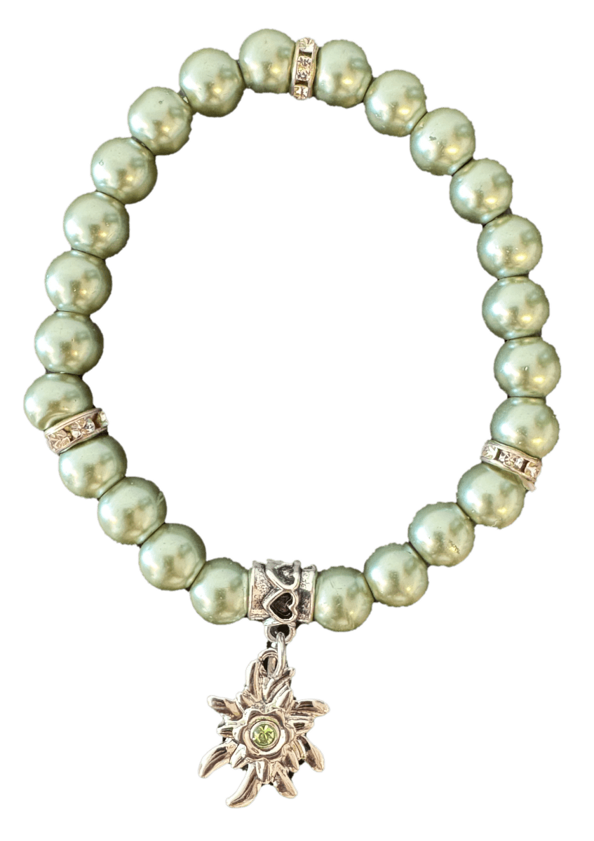 Voeg een natuurlijk en stijlvol accent toe aan iedere outfit met deze groene armband met parels en edelweiss. Het elegante ontwerp maakt de armband geschikt voor dagelijks dragen of als bijzonder cadeau.