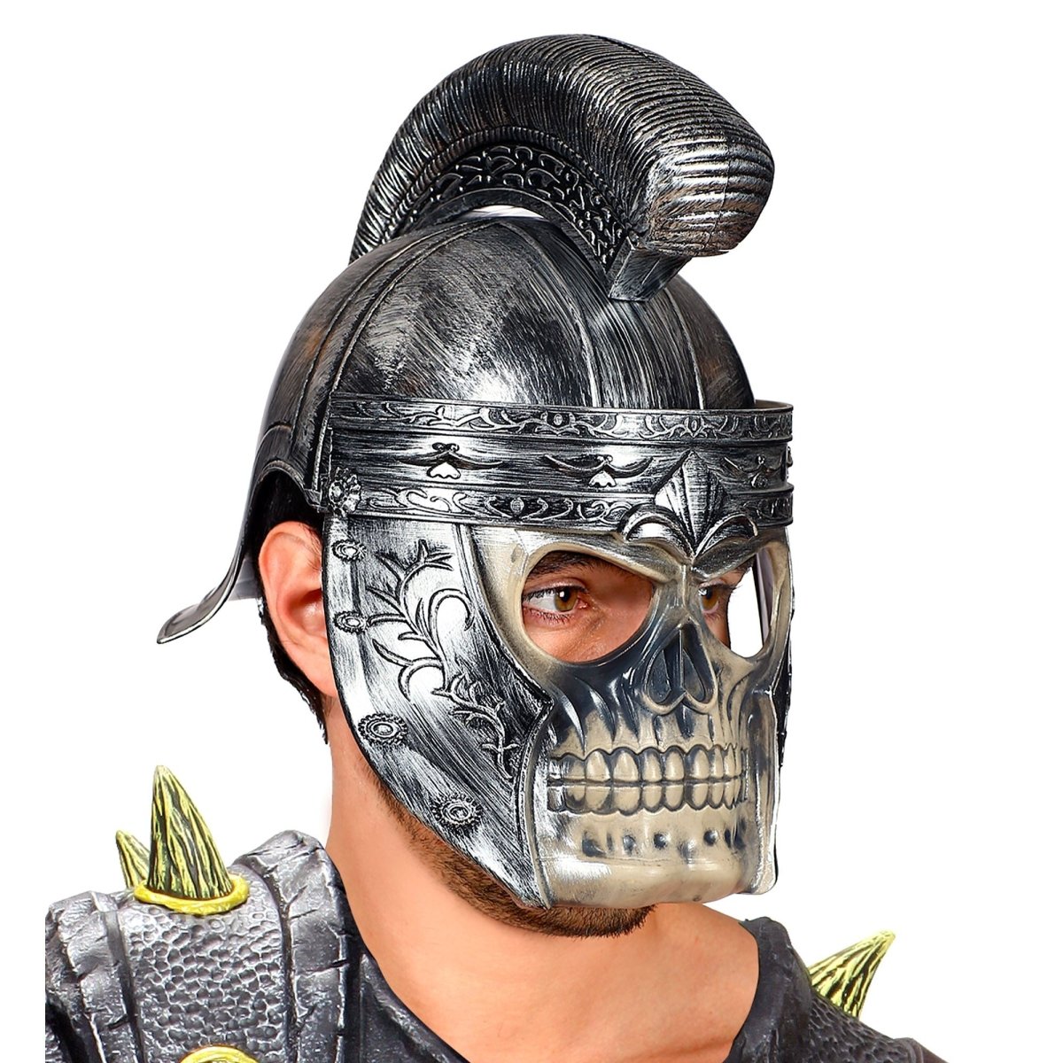 Maak je griezelige Romeinse kostuum compleet met deze zilverkleurige helm met schedeldetails. Perfect voor Halloween, themafeesten of verkleedpartijen.