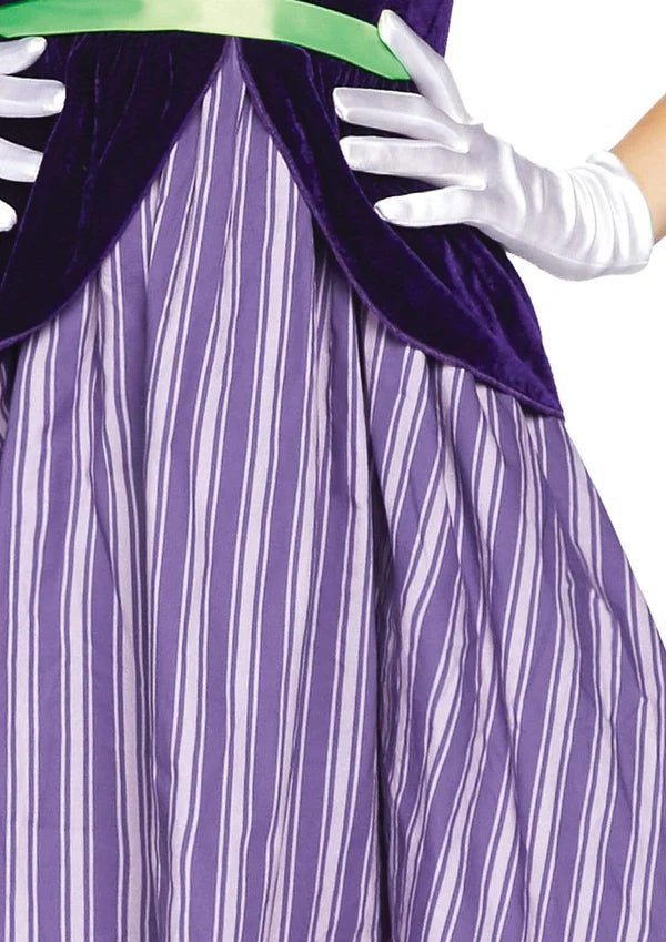 🔹 De gestreepte rok en satijnen details geven het kostuum een speelse en gedurfde flair