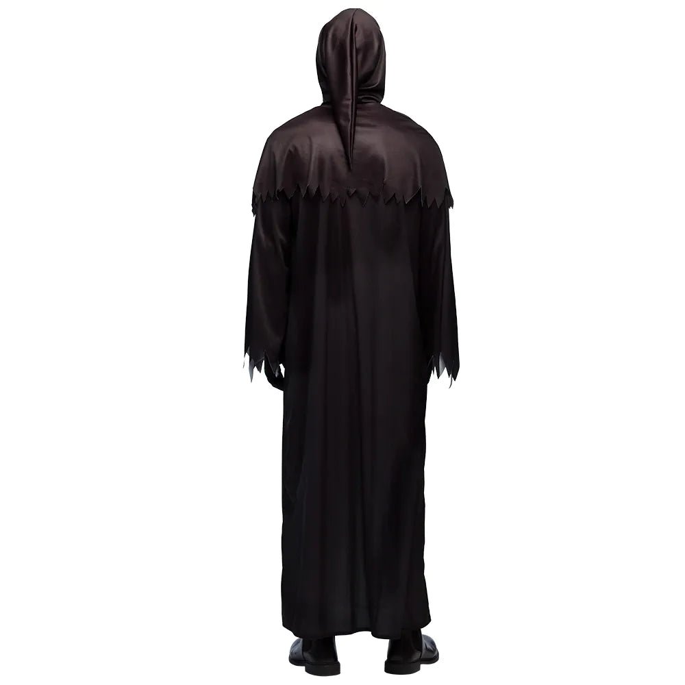 Een duister reaper kostuum voor mannen in maat 50-52. Het zwarte grim reaper kostuum bestaat een gewaad en een losse kap met karakteristieke punt. Met de groene armen onderaan het kostuum lijkt het net alsof de zielen die de reaper gegrepen heeft proberen te ontsnappen. Perfect voor iedereen die verkleed wil als Magere Hein met Halloween.