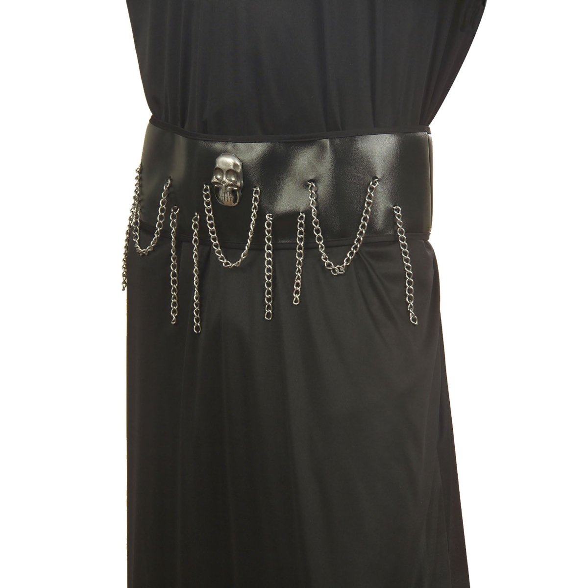 Verpakkingsinhoud: gewaad met kap, schedel halsband met kettingen, schedel riem met kettingen