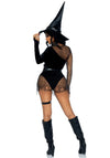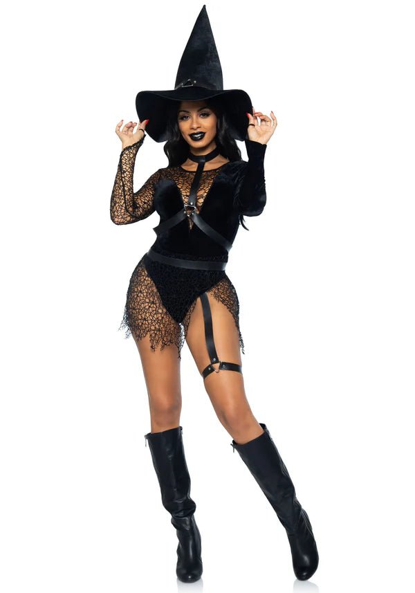 Laat je kracht en charme stralen in de ultra-sexy tovenares kostuum set van Leg Avenue! Dit kostuum bestaat uit een fluwelen bodysuit met een diep V-halslijn en drukknoopsluiting in het kruis, aangevuld met een kunstleren harnas met chocker en een klassieke fluwelen heksenhoed. De betoverende web net laagjes en de verleidelijke beenband maken deze look onweerstaanbaar, perfect voor Halloween of een magisch themafeest! 🖤🌙