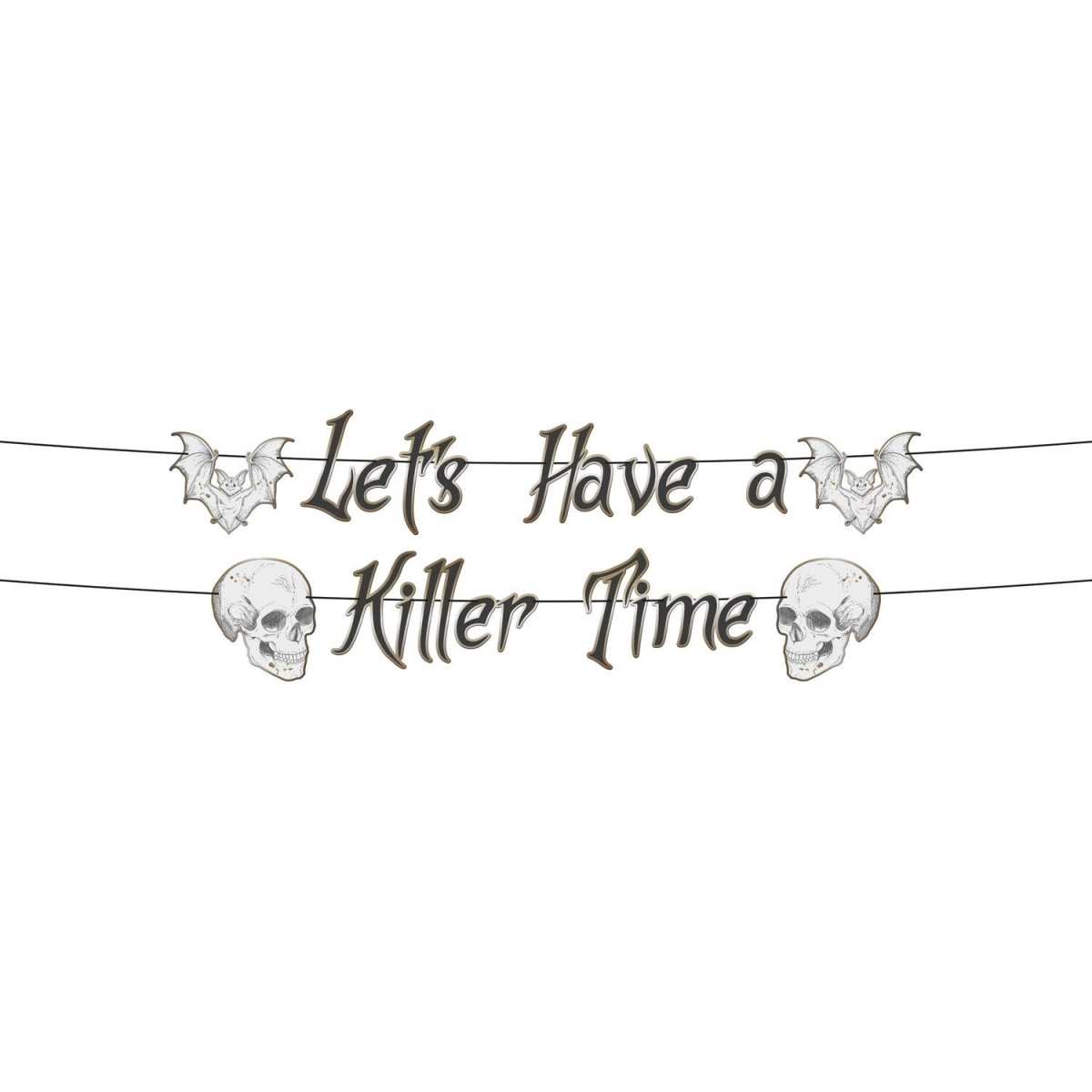 Dit wordt een geweldig feest! Letterslinger Set - Creepy Curiosities - 1 meter . Inhoud: 2 letterslingers. Bijvoorbeeld te gebruiken tijdens de volgende feestgelegenheid/feestgelegenheden: Halloween, Themafeest. Twee letterslingers die samen de zin "Let's Have a Killer Time" vormen. Aan de ene slinger zitten: "Let's Have a", met aan beide kanten een vleermuis en aan de andere slinger zitten: "Killer Time" met aan beide kanten een schedel. De letters kunnen verschoven worden over het witte polyester lint. Let op: sommige letters zitten aan elkaar vast en kunnen dus niet afzonderlijk verschoven worden. De losse letterslingers zijn elk ongeveer 1 meter lang en hebben een hoogte van 14 cm. Met echt glanzende gouden details. Dit artikel is gemaakt van papier.