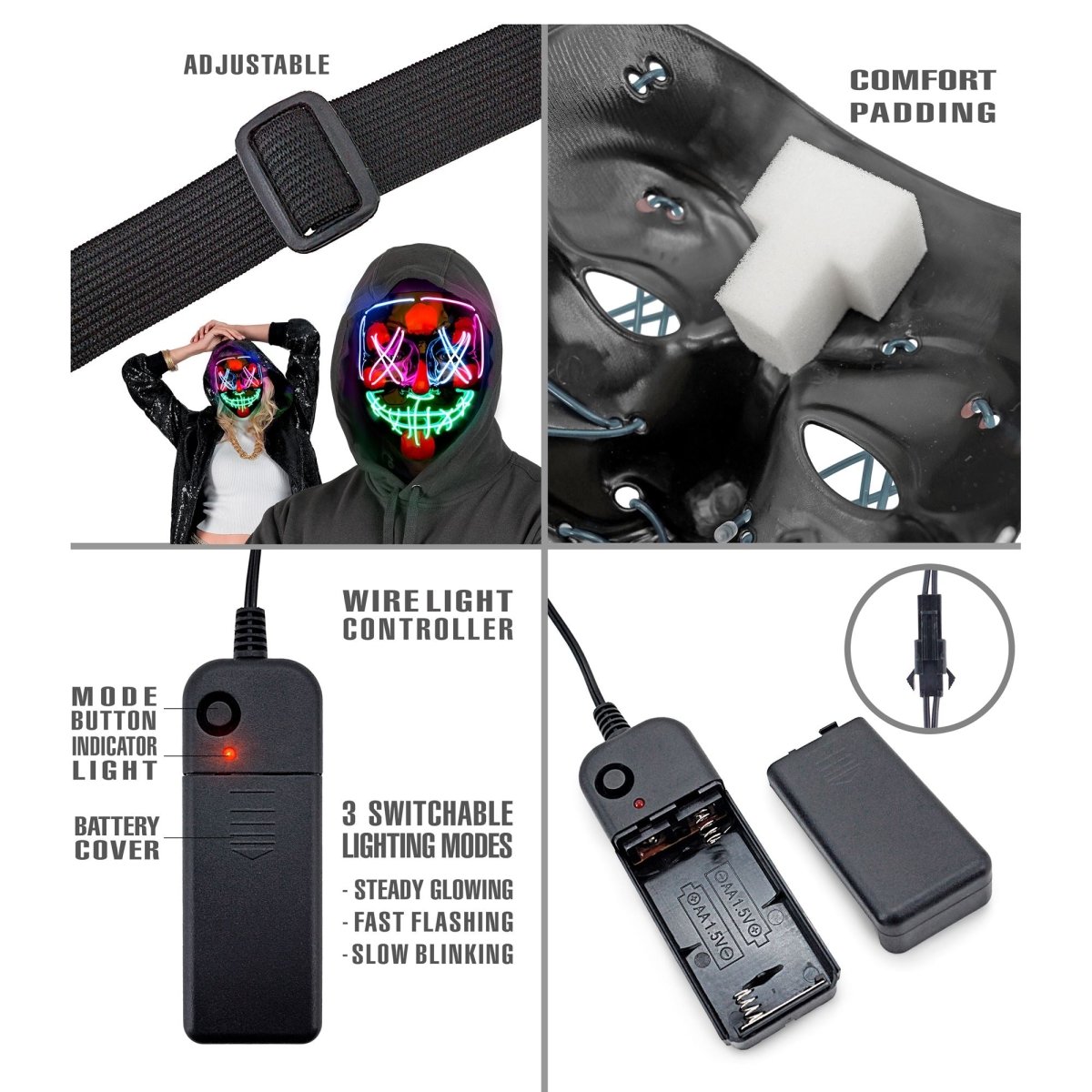 Laat je look opvallen en creëer een griezelige sfeer met dit zwarte masker met gekleurd neonlicht.