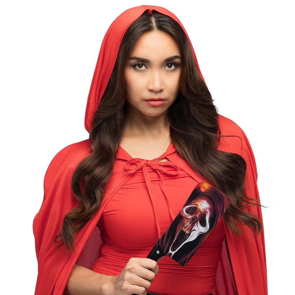 Een griezelige hakmes met angstaanjagende print waardoor het lijkt alsof het spiegelbeeld van het monster weerkaatst wordt in het mes. Het realistische ontwerp en de gedetailleerde schedelafbeelding maken dit mes het perfect accessoire voor een uniek Halloween of cosplay kostuum als slachtoffer van een mysterieuze killer, duistere kapers of horrorfiguren.