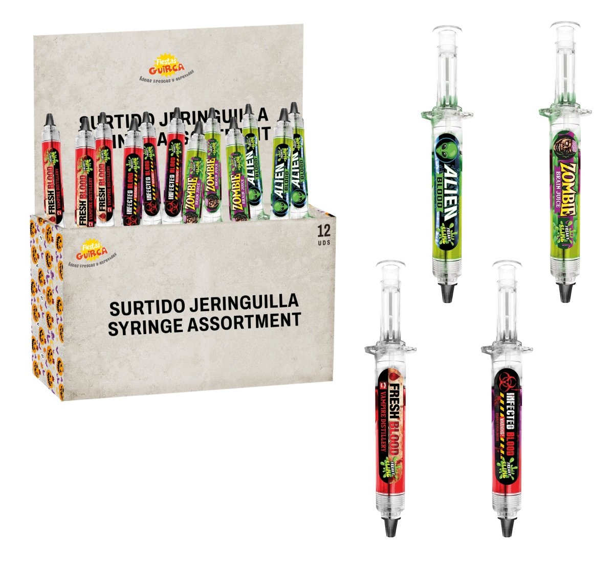 Maak je Halloweenoutfit of decoratie griezeliger met deze set van 12 nep injectiespuiten gevuld met nep bloed. Ideaal voor trick-or-treat, kostuumfeestjes, horrorcosplays of themadecoraties.