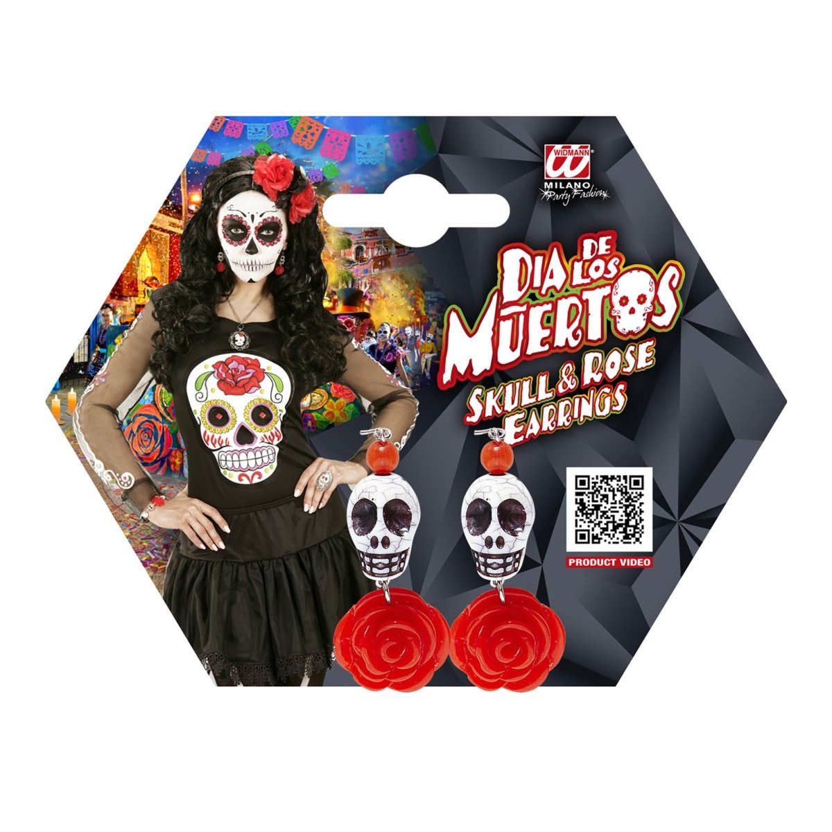 Halloween Oorbellen Rood Wit Schedels Met Roos