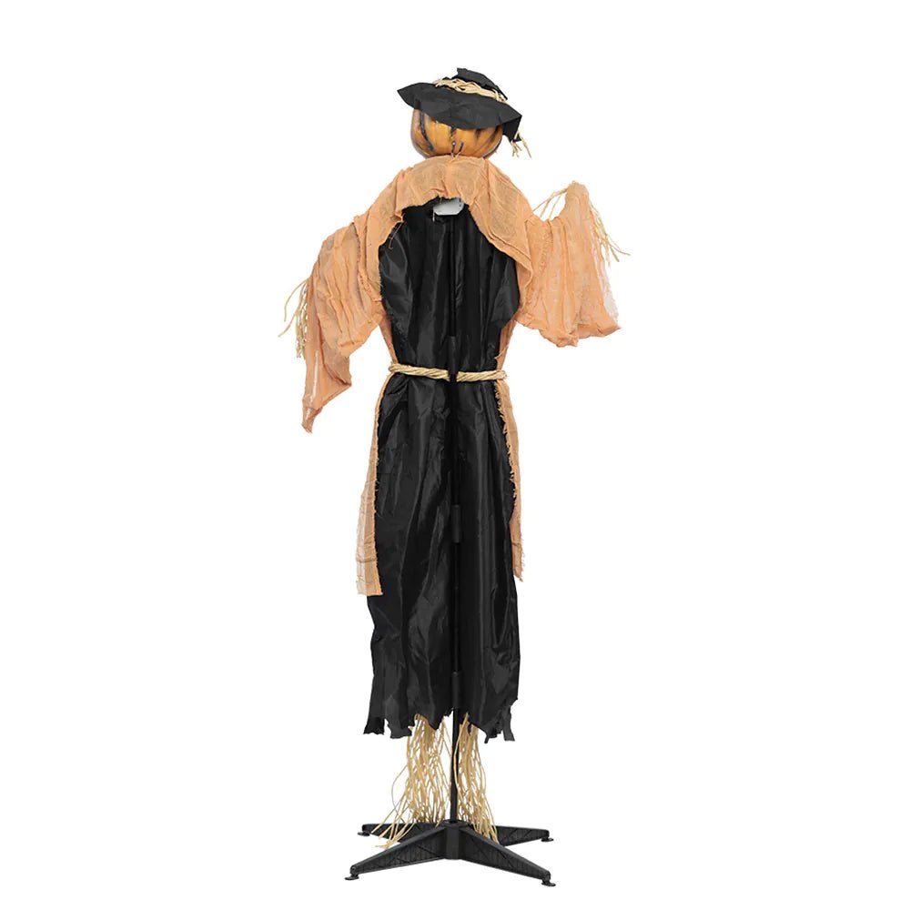 Breng je Halloween-feest tot leven met deze Boze Pompoen pop van 1,9 meter. Deze interactieve vogelverschrikker is voorzien van licht, geluid, beweging en een geluidsensor, waardoor hij reageert op geluiden en zijn hoofd beweegt, terwijl zijn rode ogen oplichten en griezelige geluiden klinken. Perfect als opvallende decoratie voor je huis, feestlocatie of spookhuis.
