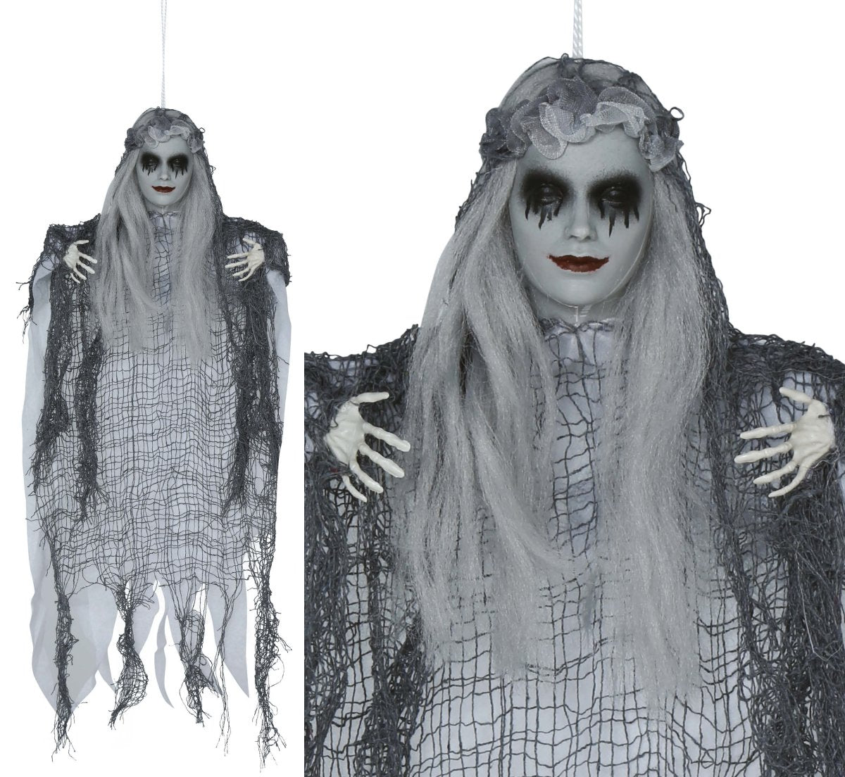 Halloween Pop Dode Vrouw 50cm is een enge hangdecoratie die zorgt voor een griezelige sfeer tijdens Halloween. Deze pop van 50 cm kan overal worden opgehangen en is perfect voor in huis, tuin of een spookhuis. Met haar angstaanjagende uitstraling is ze een echte blikvanger voor iedereen die durft te komen.