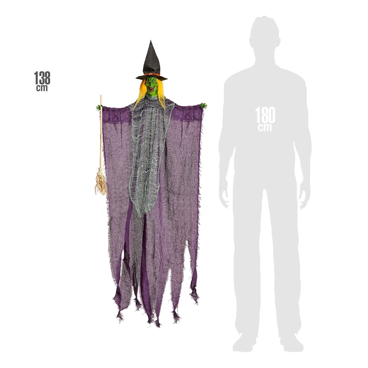 Geef je Halloweendecoratie een griezelige touch met de Halloween Pop Heks van 1,38 meter. Deze heks met bezem is ideaal voor een spookhuis, Halloween party of als decoratie in huis en zorgt voor een angstaanjagende sfeer.