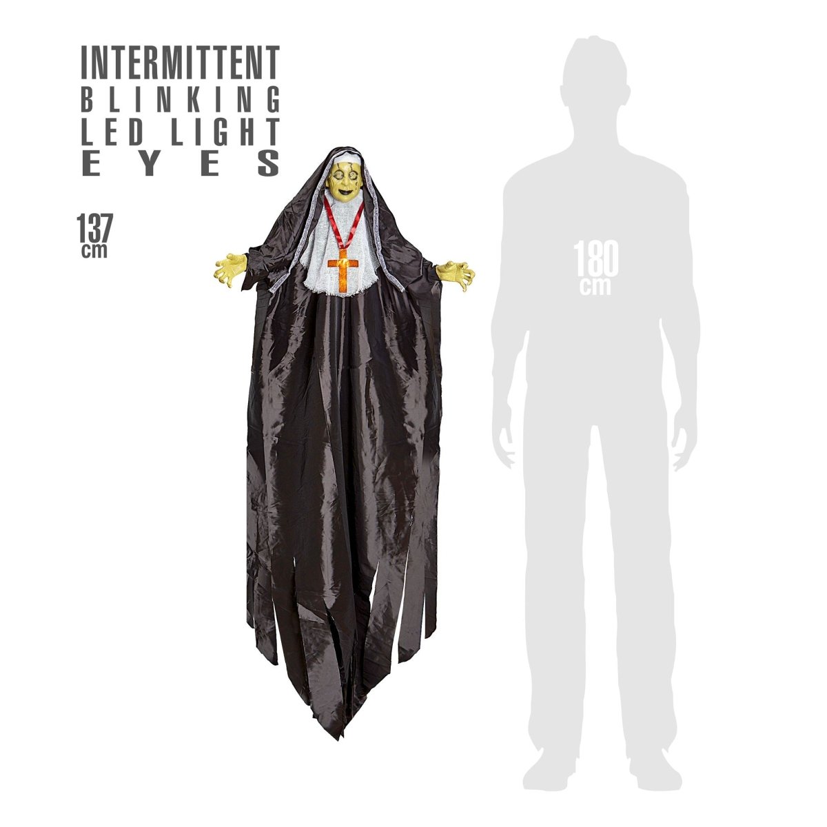 Voeg een griezelige en iconische touch toe aan je Halloweenversiering met deze Halloween pop Non met licht van 1,3 meter. Perfect voor een enge sfeer tijdens Halloween in huis of tuin.