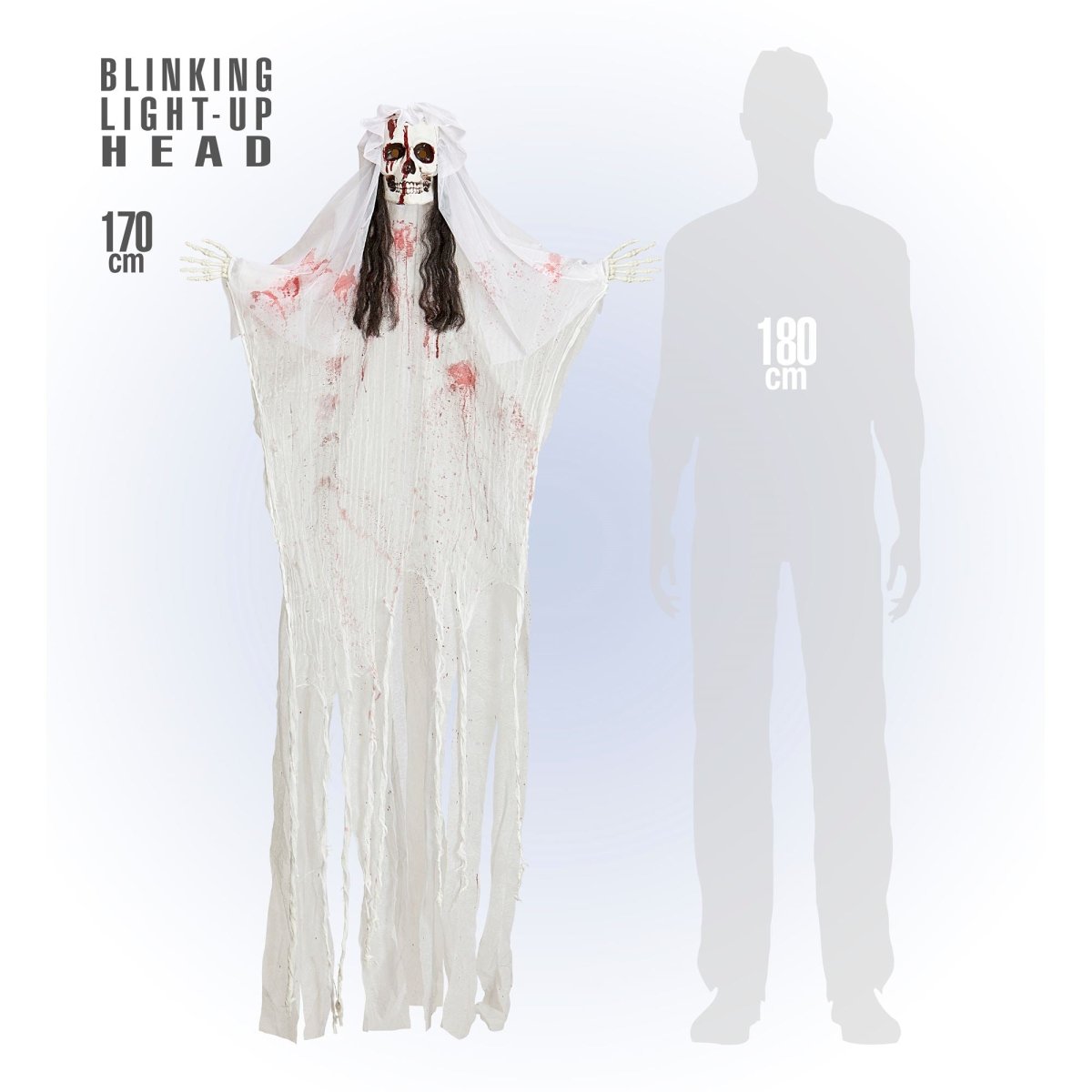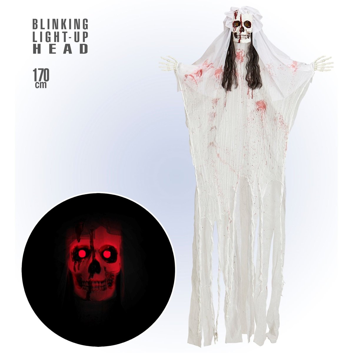 Geef je Halloweenfeest een griezelige sfeer met deze lichtgevende skeletbruid hangdecoratie. Een indrukwekkend item dat direct de aandacht trekt.