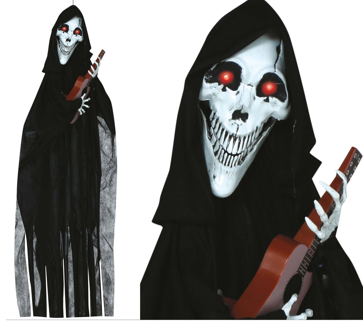 Voeg een griezelige en iconische touch toe aan je Halloweenversiering met deze Halloween Pop Skelet met Gitaar van 1,2 meter. Perfect voor een enge sfeer tijdens Halloween in huis of tuin.