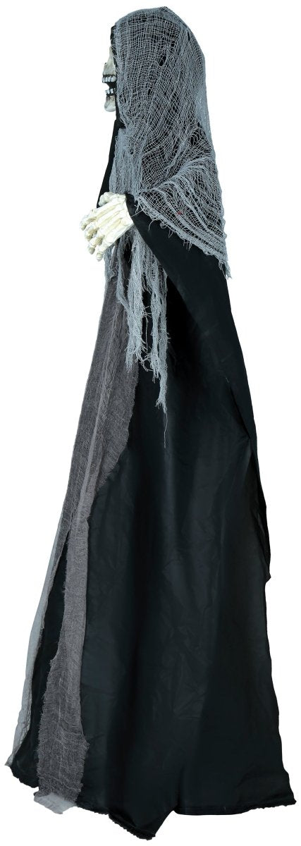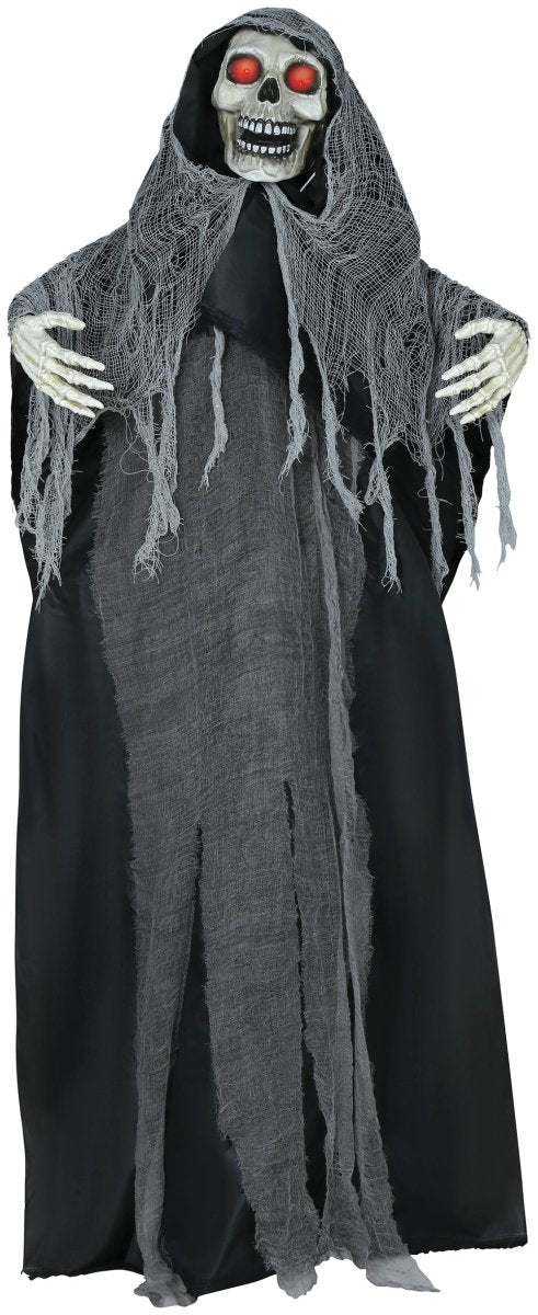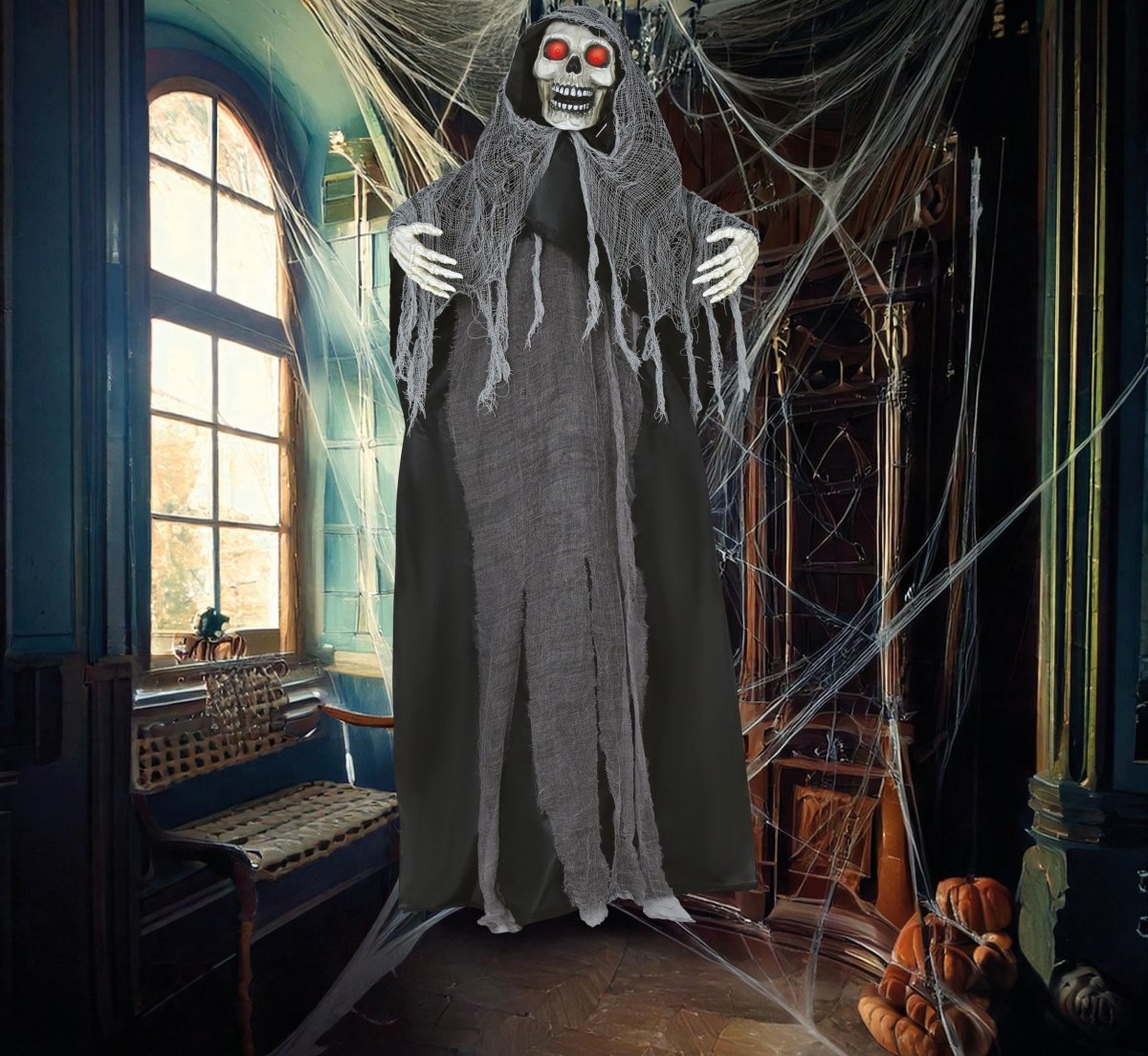 Maak je Halloween-feest extra griezelig met dit skelet van 1,7 m. Het skelet is voorzien van licht, geluid en beweging voor een interactieve en angstaanjagende decoratie.