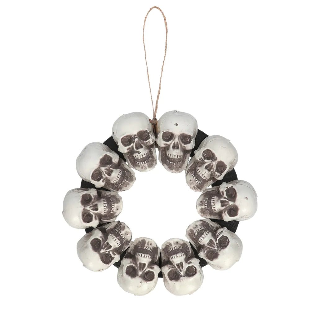 Geef je Halloweenversiering een griezelige uitstraling met deze schedelkrans van 35 cm. Hang de krans aan de deur voor een spannend welkom dat perfect past bij het Halloween-thema.