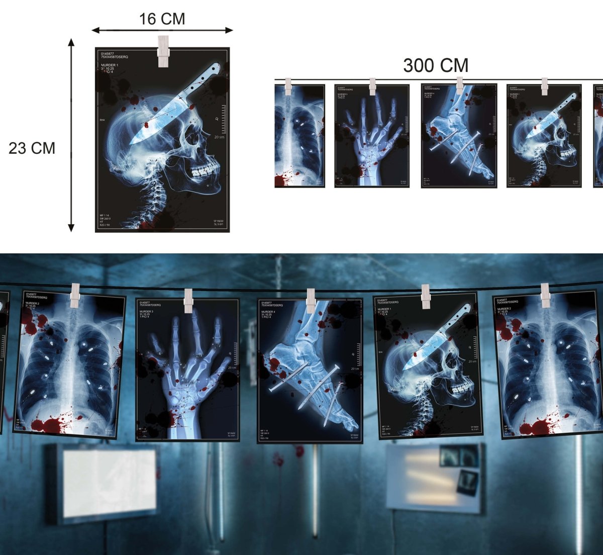 Creëer een griezelige sfeer met deze opvallende Halloween slinger. Het radiografische design zorgt voor een uniek en spannend effect, ideaal voor je Halloween-feest.