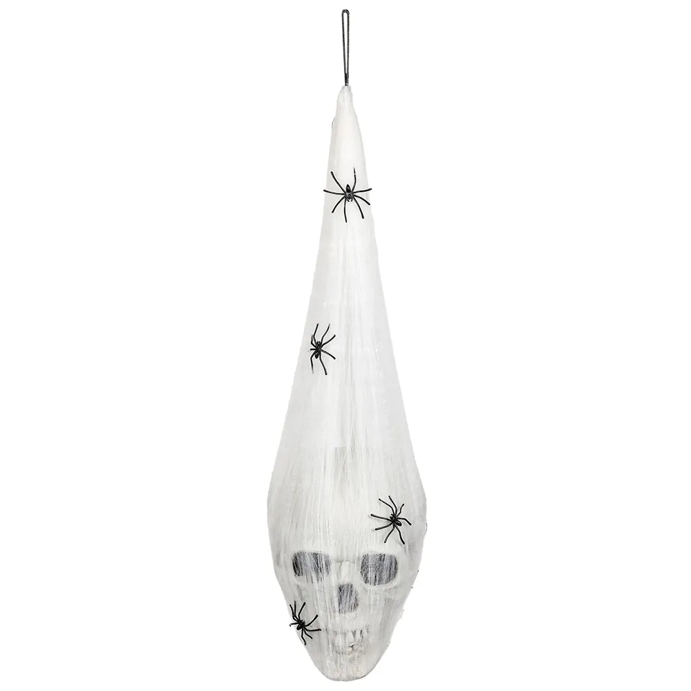 Met Halloween mag het eng en gruwelijk zijn, dus hang deze lugubere decoratie van een skull met oplichtende ogen en gewikkeld in spinrag op en jaag iedereen de stuipen op het lijf. De decoratie heeft een handig lusje om het gemakkelijk op te hangen. De perfecte decoratie voor je Halloween party.