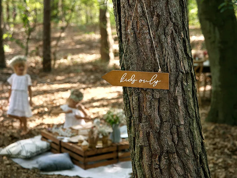 Dubbelzijdige wegwijzer van hout met wit opschrift Kids only, afmeting van de wegwijzer: ca. 36 x 7,5 cm, lengte van het touw ca. 60 cm.