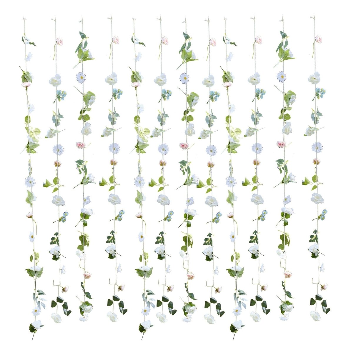 Dit mooie bloemengordijn bevat: 12 x 1,8 m strengen kunstbloemen op touw.