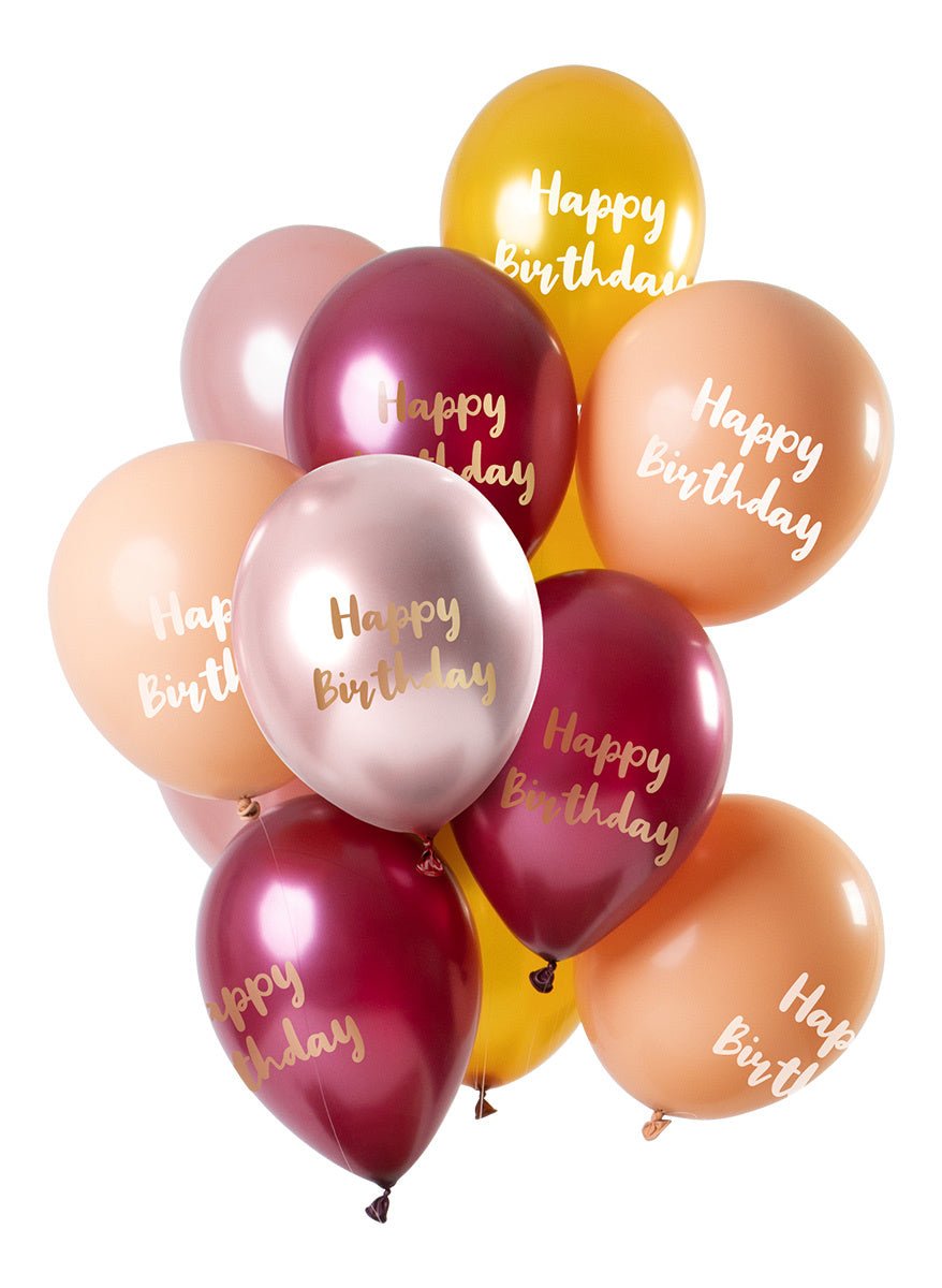 Ballonnen 'Happy Birthday' Roze-Goud 30cm - 12 stuks. Inhoud: 12 latex ballonnen. Kleur: Roze. Bijvoorbeeld te gebruiken tijdens de volgende feestgelegenheid/feestgelegenheden: Verjaardag, Kinderfeestje. Elke ballon is 12 inch/30 cm. Het artikel is gemaakt van latex.