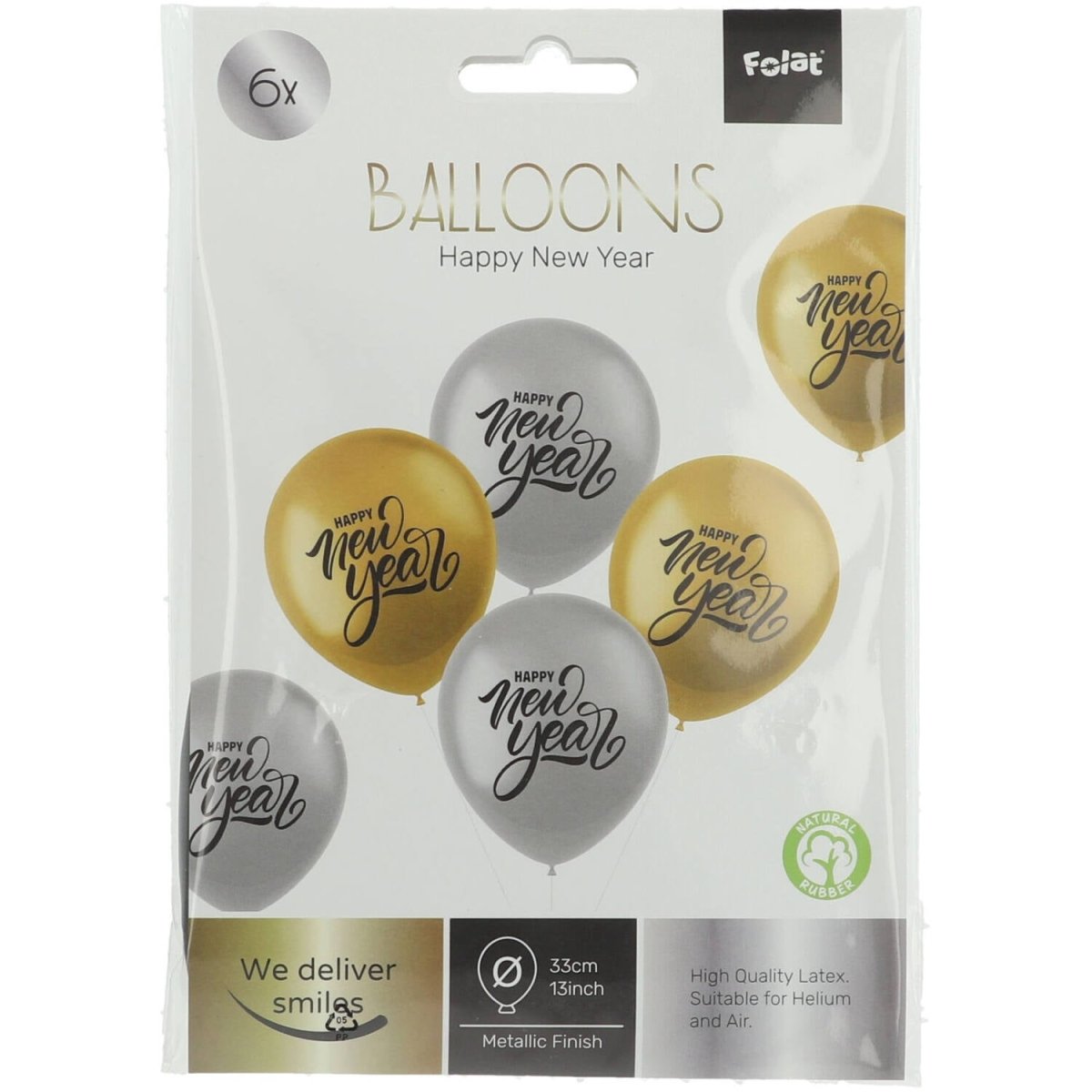 Ballonnen Happy New Year 33cm - 6 stuks. Inhoud: 6 latex ballonnen. Kleuren: goudkleurig en zilverkleurig. Bijvoorbeeld te gebruiken tijdens de volgende feestgelegenheid/feestgelegenheden: Oud & Nieuw. Elke ballon is 13 inch/33 cm. Het artikel is gemaakt van latex.