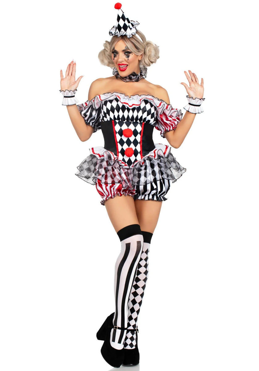Breng het circus tot leven met het 4-delige Darling Harlekijn kostuum van Leg Avenue! Dit flirterige en leuke kostuum bestaat uit een bloomer romper met ruches en pompomaccenten, pols- en nek ruches, en een clownshoed-hoofdband. Deze charmante Halloween look is perfect voor een circusgeïnspireerd themafeest of Halloweenavond. Maak de look compleet met thematische dijverhogers en gezichtsjuwelen (apart verkrijgbaar). 🎪💫