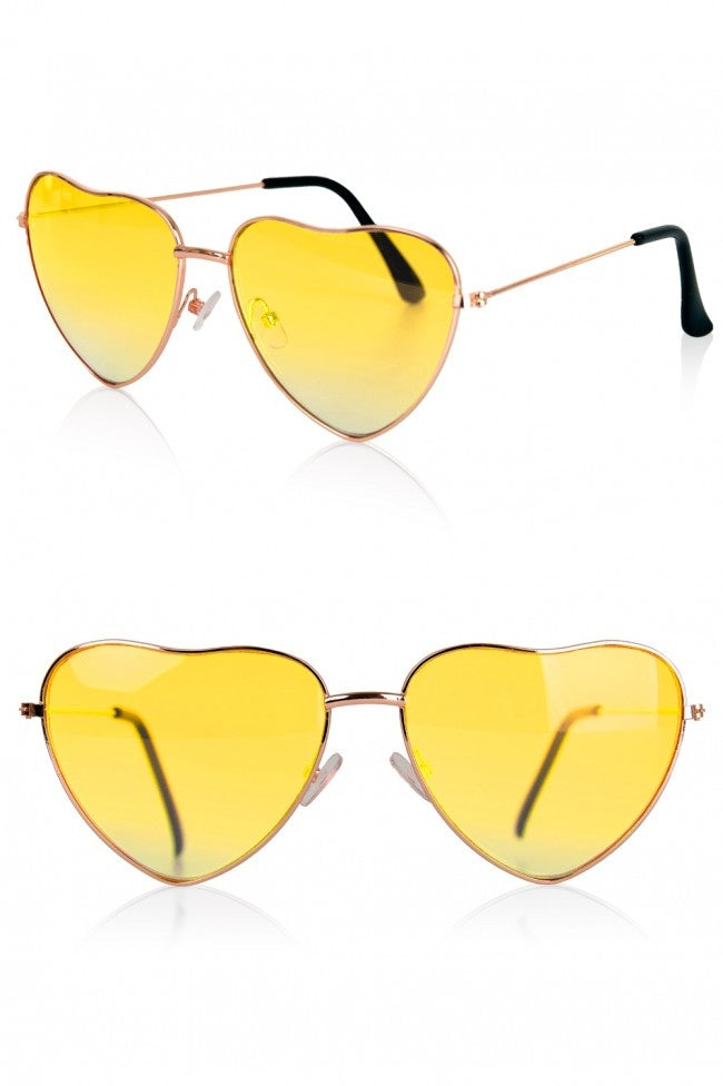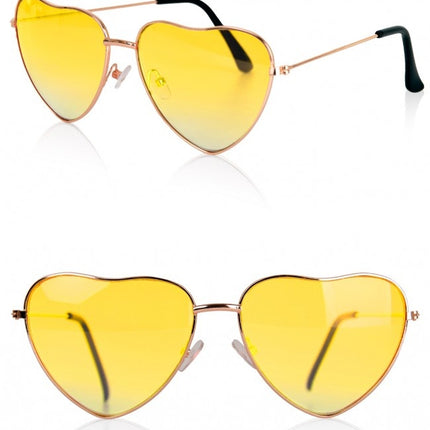 Hartjes bril met zilveren metalen montuur en licht getinte gele glazen. De bril valt als een one size, volwassen maat en komt in verschillende kleuren! Leuke bril die jouw outfit helemaal compleet maakt met carnaval of een ander feestje!