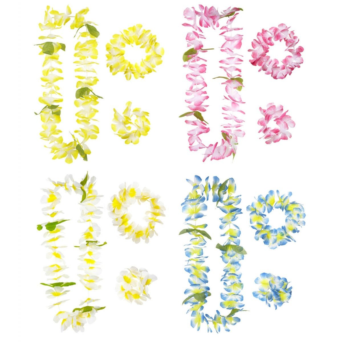 Inhoud set: hawaii krans, kroon en armband allemaal gemaakt van kleurrijke grote hawaii bloemen.