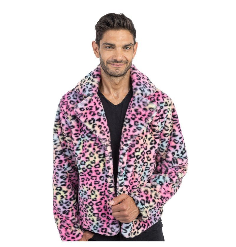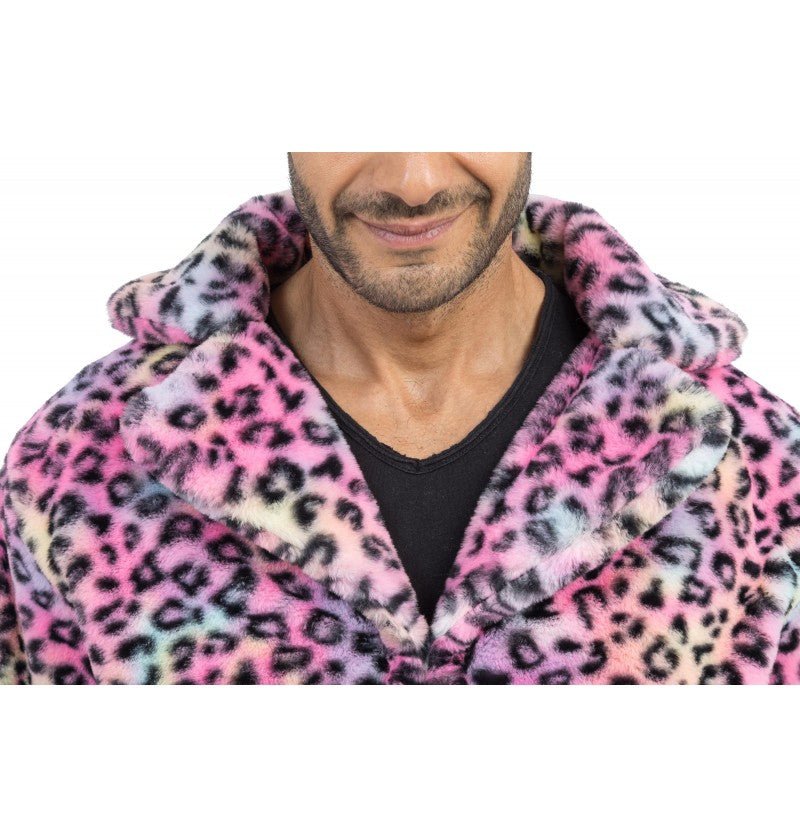 Een opvallende herenjas die comfort en stijl combineert met een levendige multicolor luipaardprint voor een gedurfde en unieke look.