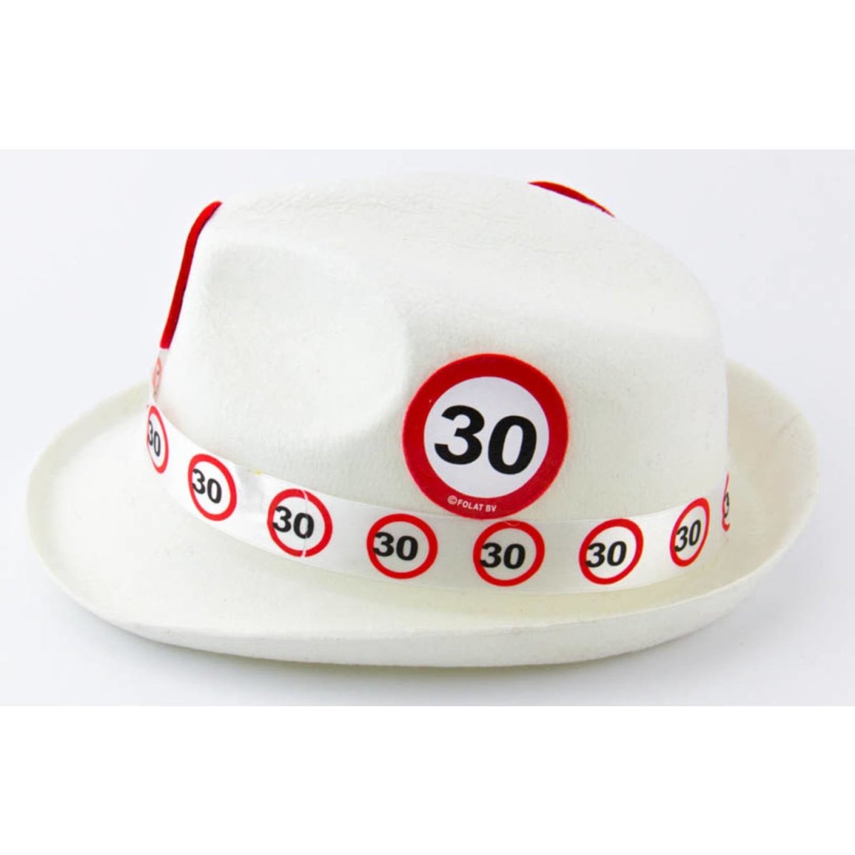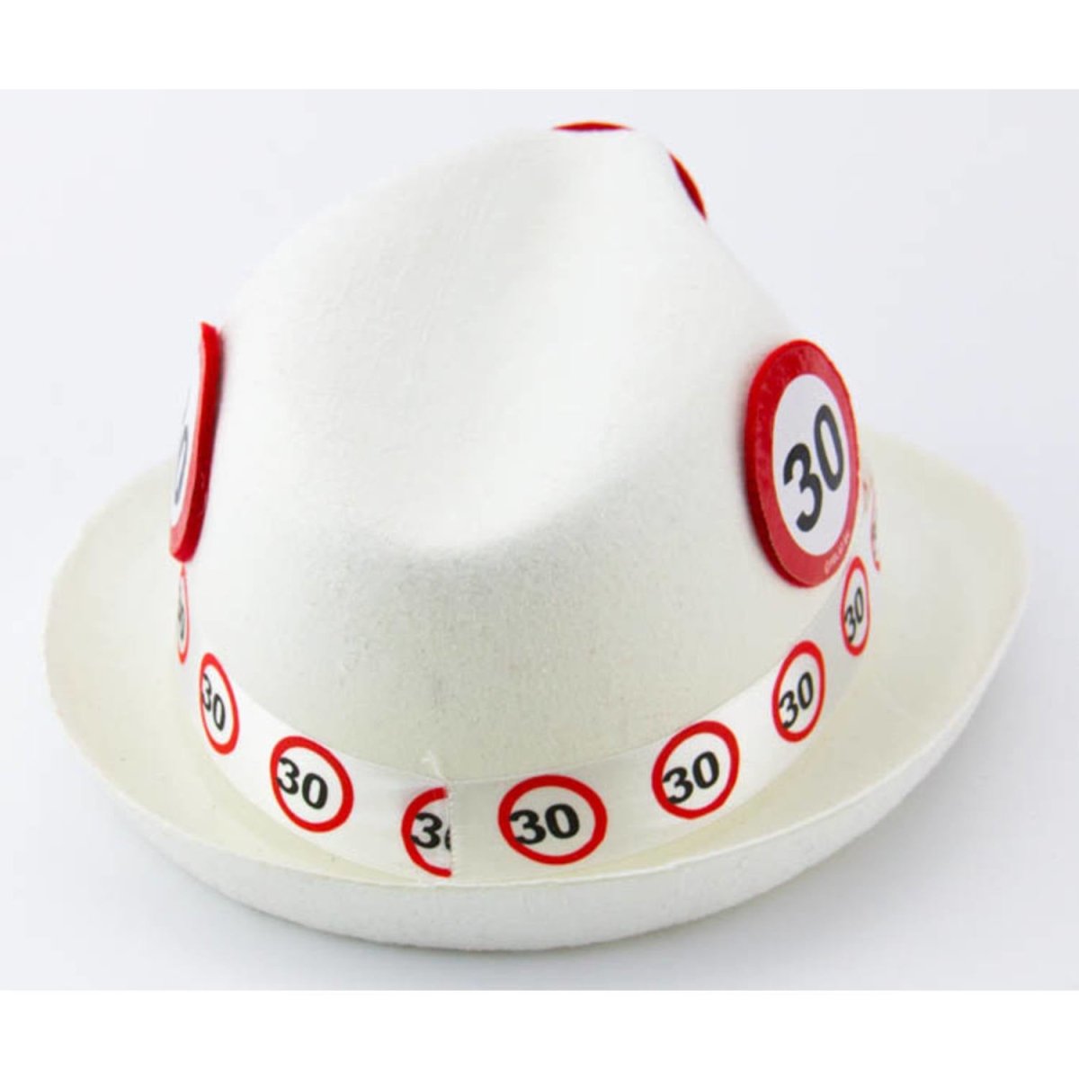 30 Jaar Verkeersbord Trilby Hoed Wit. Inhoud: 1 hoed, kleur: Wit. Bijvoorbeeld te gebruiken tijdens de volgende feestgelegenheid/feestgelegenheden: Carnaval, Themafeest, Halloween. Deze hoed is 23 cm breed en 37cm hoog. Het artikel is gemaakt van polyester.