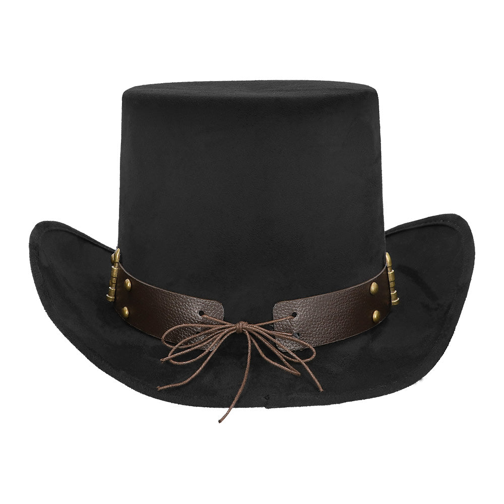 Maak jouw industriële steampunk look helemaal af met de indrukwekkende Bulletpunk hoed. Deze stijlvolle hoge hoed heeft een luxe suède look en is afgewerkt met een stoere leren band vol metalen details — waaronder een adelaar en kogelvormige studs — voor die kenmerkende retro-futuristische steampunk uitstraling. Dankzij de elastische binnenband heeft de hoed een comfortabele pasvorm en blijft hij goed zitten tijdens elk feest.