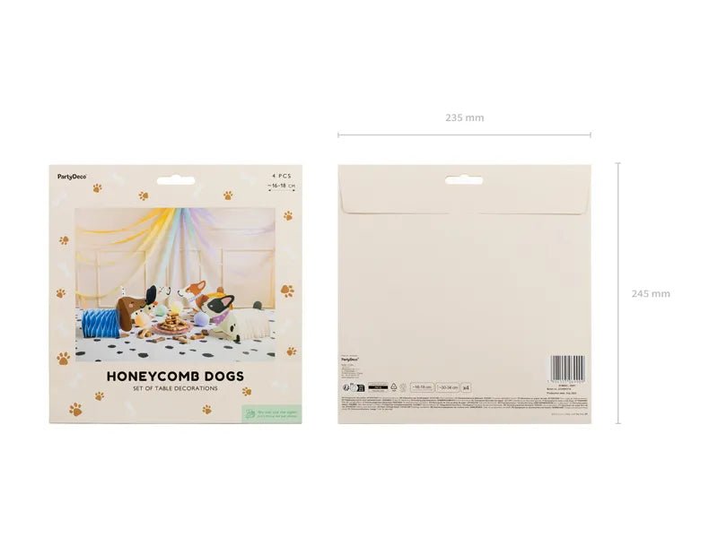 Papieren honingraat decoraties Doggies, set bestaat uit 4 soorten, lengte ca. 30-34 cm, hoogte ca. 16-18 cm. Doe-het-zelf-product. 4 stuks.